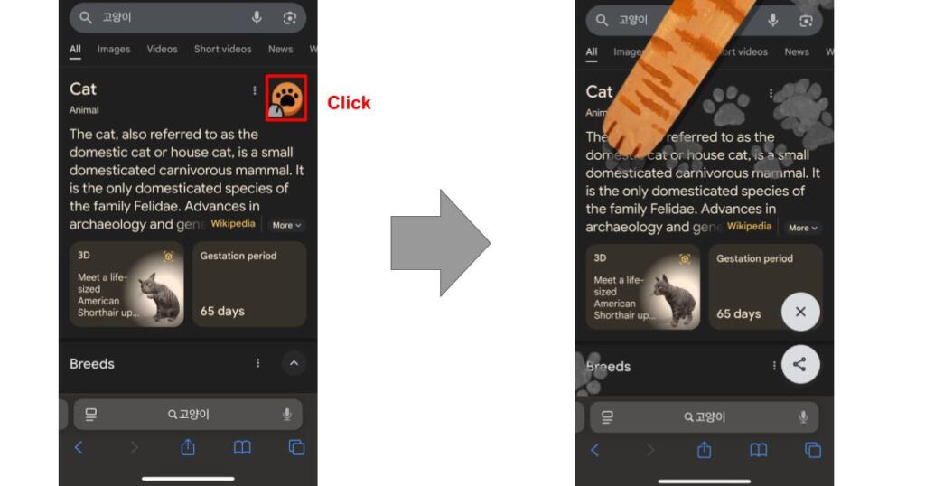 고양이와 구글 에서 검색하면, 고양이의 손이 뻗어 나와 육구의 스탬프를 화면상에 표시시키는 것이 가능합니다. 꼭 화면을 귀여운 육구로 채워보세요.