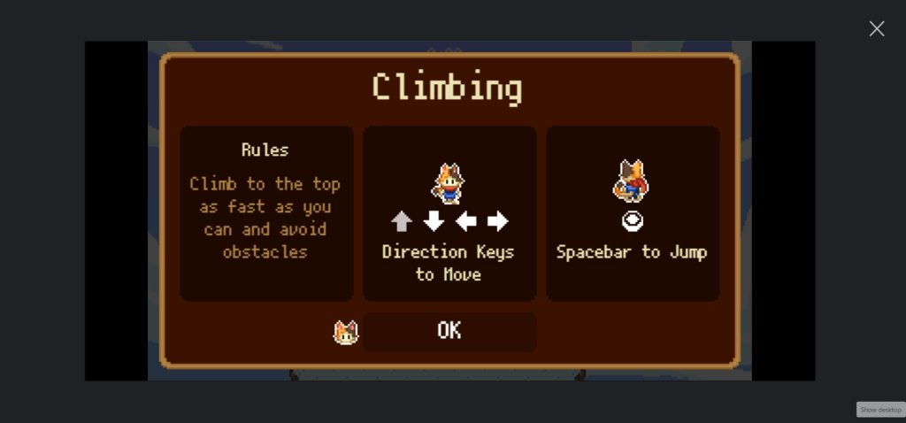 스포츠 클라이밍은 「치캅카무이」와 대전해, 산중의 평지에서 플레이 가능. 클리어 조건은 시간 1:29에서 정상에 가는 것입니다.